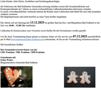 die Fraktionen der Bad Endbacher Gemeindevertretung möchten erneut alle Grundschulkinder und Kindergartenkinder ab 3 Jahren zu einem weihnachtlichen Lebkuchenmännchen dekorieren einladen.