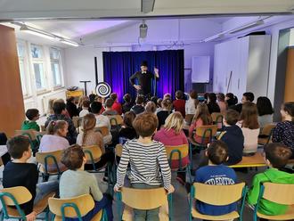 Sie lernten einen Zauberer kennen, der allen Schülerinnen und Schülern eine große Auswahl an teilweise schwierigen Zaubertricks zeigte. Vom Einsteintrick bis zum Superblitzknoten war alles dabei. Danach hieß es üben, üben, üben für die Kinder. Jeden Trick so oft, wie die Anzahl der Sterne auf der Hose des Zauberers, 222 mal.