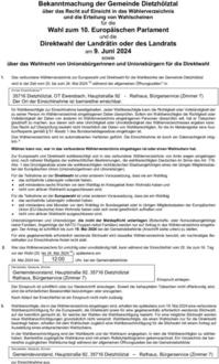 Wahlbenachrichtigung für die Europawahl, die Direktwahl sowie für eine gegebenenfalls erforderlich werdende Stichwahl,