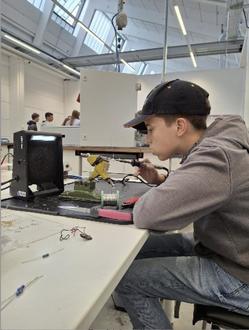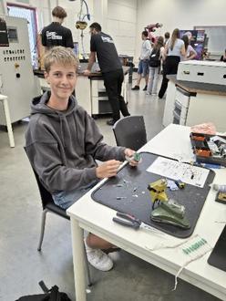 Philip Schmitt (9G2) sitzt an der Werkbank für Elektronik
