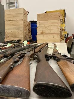 Bildunterschrift: Der größte Waffen- und Munitionsfund in den vergangenen Jahren hat Mitarbeitende des Lahn-Dill-Kreises beschäftigt. 35 Waffen und mehrere hundert Kilogramm Munition liegen sortiert bereit zur Vernichtung. Foto: Lahn-Dill-Kreis