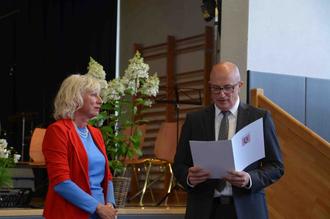 Als Schulleitungsmitglied führte Patrick Zapf locker und humorvoll durch das Programm, nach der Begrüßung der zahlreichen Ehrengäste. In ihren Grußworten stellten alle Rednerinnen und Redner die besonderen Eigenschaften der scheidenden Schulleiterin heraus: ihre überdurchschnittliche Einsatzbereitschaft zum Wohle der Schulgemeinde, Bodenständigkeit und Pragmatismus, Pünktlichkeit und Zuverlässlichkeit, Ehrlichkeit und Geduld, aber auch Geselligkeit und einen ausgeprägter Familiensinn - dies alles versehen mit einer guten Prise norddeutschen Charmes. Der Leitende Regierungsdirektor und Leiter des Staatlichen Schulamts Limburg-Weilburg, Michael Scholz überreichte nach seiner ausführlichen Laudatio der scheidenden Schulleiterin, der „First Lady der Holderbergschule“, die Urkunde zum Eintritt in den Ruhestand.