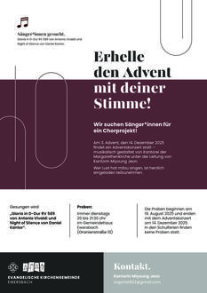 Die Kantorei der Margarethenkirche wird das Adventskonzert am 3. Adventssonntag, 14.Dezember 2025 musikalisch gestalten. Unter der Leitung von Kantorin Miyoung Jeon werden „Gloria in D-Dur RV 589 von Antonio Vivaldi und Night of Silence von Daniel Kantor“ gesungen.