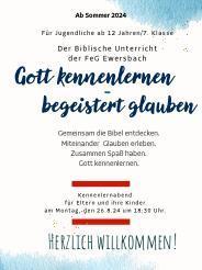 | TEXT FÜR Plakat: Ab Sommer 2024 Für Jugendliche ab 12 Jahren/7. Klasse Der Biblische Unterricht der FeG Ewersbach Gott... Gemeinsam die Bibel entdecken. Miteinander Glauben erleben. Zusammen Spaß haben. Gott kennenlernen. --- Kennenlernabend für Eltern und Kinder am Montag, den 26.08.2024 um 19.30 Uhr Herzl... |