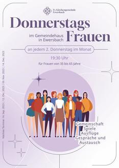 | 19.30 Uhr | DonnerstagsFrauen für Frauen von 35 bis 65 Jahre, Ev. Gemeindehaus |