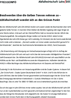 „Der Grüne Punkt – Duales System Deutschland GmbH“ in Köln. Und für die Abfuhr der im Lahn-Dill-Kreis über die Gelben Tonnen gesammelten Leichtverpackungen hat der Grüne Punkt das Entsorgungsunternehmen Knettenbrech + Gurdulic Mittelhessen mit Sitz in Solms beauftragt. Dies ist unter Tel. 0800 1015860 und www.knettenbrech-gurdulic.de erreichbar.