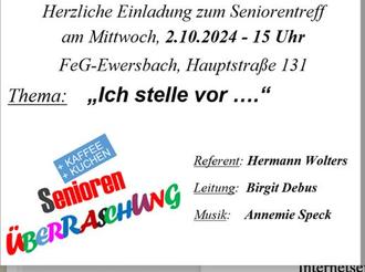 | 15.00 Uhr | Seniorenkreis (1. Mittwoch im Monat) |