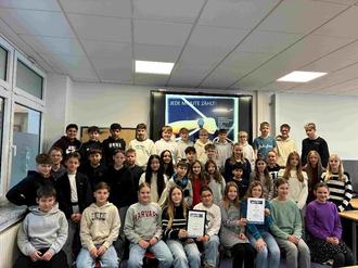 Stolz präsentieren die 7G1 und die 6R2 die Siegerurkunden ihrer Klassen im Wettbewerb "Jede Minute zählt".