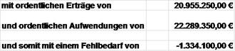 In der Haushaltsrede des Bürgermeisters wurden die Positionen 24 Gesamtsumme der ordentlichen Erträge -20.955.250 Euro sowie 25 Gesamtsumme der ordentlichen Aufwendungen 22.289.350 Euro genannt.