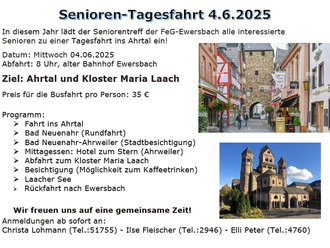 | 15.00 Uhr | Seniorenkreis (1. Mittwoch im Monat) |