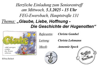 | 15.00 Uhr | Seniorenkreis (1. Mittwoch im Monat) |