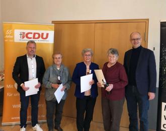 Für 60 Jahre Mitgliedschaft in der CDU wurde in Abwesenheit geehrt: Helmut Weber, für 50 Jahre: Udo Grosch, für 45 Jahre: Erna Heller, Anneliese Leinberger, Christel Rech und Erna Reinhardt, für 25 Jahre in Abwesenheit Norbert Huder, für 20 Jahre Thorsten Roch und für 10 Jahre in Abwesenheit Andreas Höhl.