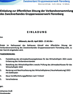 Am Mittwoch, den 05. April 2023 - 17.45 Uhr – findet im Rathaussaal des Rathauses Künzell eine öffentliche Sitzung der Verbandsversammlung des Zweckverbandes Gruppenwasserwerk Florenberg statt, zu der hiermit eingeladen wird.