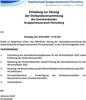 Am Dienstag, den 16.04.2024 - 17.45 Uhr – findet im Bürgerhaus Dirlos eine öffentliche Sitzung der Verbandsversammlung des Zweckverbandes Gruppenwasserwerk Florenberg statt, zu der hiermit eingeladen wird.