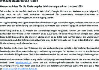 Seitens des Hessischen Ministeriums für Wirtschaft, Energie, Verkehr und Wohnen wurde mitgeteilt, dass auch im Jahr 2023 weiterhin Fördermittel für barrierefreie Umbaumaßnahmen im selbstgenutztem Wohneigentum zur Verfügung stehen.