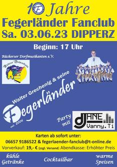 anlässlich seines 10-jährigen Bestehens präsentiert der „1. Fegerländer Fanclub Deutschland 2013 e.V.“ am Samstag, den 03. Juni 2023 „Walter Grechenig & seine Fegerländer“. Lassen Sie sich dieses einzigartige Bühnenerlebnis, in der es neben traditioneller Blasmusik auch Show und Überraschungen geben wird, nicht entgehen und sichern Sie sich eine der begrenzten Karten für das einzige Konzert 2023 in Deutschland im Bürgerhaus Dipperz.