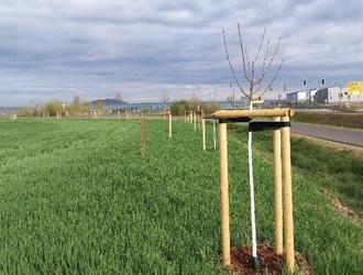 Die neu gepflanzten Bäume beim Regenrückhaltebecken für die Bundesstraße im