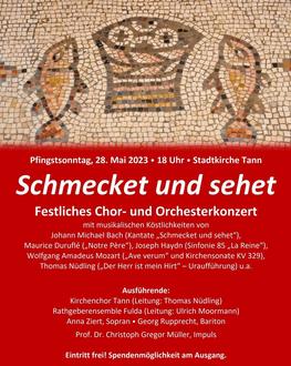 Beim Konzert „Schmecket und sehet“ geht es um musikalisch gedeckte Tische: Am Pfingstsonntag, 28. Mai um 18 Uhr in der Stadtkirche Tann gestalten der Kirchenchor Tann (Leitung: Thomas Nüdling) und das Rathgeberensemble Fulda (Leitung: Regionalkantor Ulrich Moormann) mit Sopranistin Anna Ziert und Bariton Georg Rupprecht ein Programm, das sich des Essens und Trinkens annimmt. Zu Gehör kommen musikalische Köstlichkeiten von Johann Michael Bach (Kantate „Schmecket und sehet“), Maurice Duruflé („Notre Père“), Joseph Haydn (Sinfonie 85 „La Reine“), Wolfgang Amadeus Mozart („Ave verum“ und Kirchensonate KV 329), Thomas Nüdling („Der Herr ist mein Hirt“ – Uraufführung) u.a.