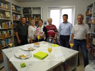 Jetzt wurde die neu gestaltete Bücherei mit einem Sektumtrunk eingeweiht. Die Mitarbeiterinnen der Bücherei begrüßten den Bürgermeister Klaus-Dieter Vogler, Patrick Kümmel vom Ortsbeirat, Alexandra Übelacker in ihrer Funktion als Kuratorin der Pfarrgemeinde, die Sprecherin des Pfarrgemeinderates, Jutta Goldbach, und Markus Wingenfeld. Herr Wingenfeld, Mitglied des Pfarrverwaltungsrates und Schreinermeister der Firma Schramm, hatte die Regale geplant. Pfarrer Kownacki konnte den Termin leider nicht wahrnehmen, da er zeitgleich einen Gottesdienst hatte. Frau Goldbach überbrachte seine Grüße.