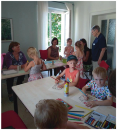 Zwischendurch wurden die Kinder immer wieder durch Fragen von Frau Tensing zum Mitdenken angeregt. Zum Abschluss hatten die Kinder zusammen mit ihren Mamas noch viel Spaß beim Ausmalen und Basteln von Elefanten.