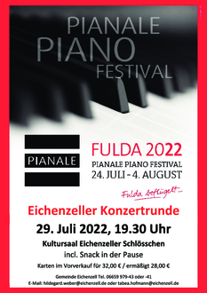 Eine Auswahl dieser Teilnehmerinnen und Teilnehmer gestaltet das Konzert am 29. Juli um 19.30 Uhr im Kultursaal des Eichenzeller Schlösschens. Bei der „Eichenzeller Konzertrunde“ ist es schöne Tradition, dass nicht nur ein musikalischer, sondern auch ein kulinarischer Genuss geboten wird. Die Konzertkarte beinhaltet einen Begrüßungssekt und einen Snack in der Pause.