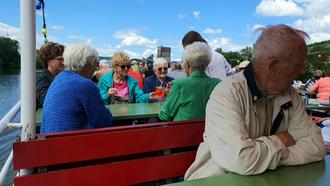 Gemäß dem Programm geht es anschließend zur Schiffsanlegestelle „Alter Kranen“, um mit der Veitshöchheimer Personenschifffahrt unsere zweite Ausflugsstation Veitshöchheim zu erreichen. Auf dem sonnenbeschienen Oberdeck genießen wir die Fahrt und bekommen die Sehenswürdigkeiten rechts und links des Flusses erklärt. Dort gilt der erste Besuch der Nr. eins von zahlreichen Aktivitäten, nämlich einem der bedeutendsten Rokokogärten in Deutschland. Das darin gelegene Schloss war bis 1802 der Sommersitz der Würzburger Fürstbischöfe. Mit zwei Gästeführern erleben wir die fabelhaft großflächige Gartenanlage. Zu entdecken sind die heckenumsäumten Wege sowie der geschichtliche Hintergrund des Gartens. An jeder Ecke eröffnen sich neue Sichtachsen auf Lauben, Pavillons und Rondells. Eine Besonderheit ist der große See, in dessen Mitte der Musenberg Parnass thront. Wir hatten das Glück, zu dem Zeitpunkt der großen Wasserspiele anwesend zu sein und sie zu bestaunen.