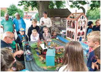 Jahren Maschinen mit Dampf angetrieben wurden. Dazu hatte Herr Rüdiger Hain aus Fulda seine Miniaturen mitgebracht. Auf einem großen Jahrmarktareal mit Schiffschaukeln, Kettenkarussell, Riesenrad und vielen Jahrmarkt-Besuchern drehte ein Dampf-Fahrzeug mit Anhänger seine Runden. Ein Fabrikgebäude mit hohem Schornstein zeigte die unterschiedlichsten Arbeitsgeräte, die alle mit Dampf angetrieben wurden, z. B. eine Bügelsäge, eine Stanze, eine Bohrmaschine, einen Schleifbock usw. Die Mitarbeiter der Fabrik waren bei der Arbeit, aber auch in der Arbeitspause beim Kartenspielen zu sehen.