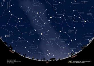 Im Zenit des August-Nachthimmels bilden wie im Vormonat Juli die hellen Sterne Wega, Deneb und Atair das sogenannte Sommerdreieck. Andere markante Sterne zeigen die Himmelsrichtungen wie ein Kompass: Arktur im Westen, Antares im Süden, Polaris im Norden und der füllige quadratische Leib des Dichterpferds Pegasus im Osten. Im Schleier der Milchstraße funkeln von Nordost nach Südwest über den Zenit hinweg die Sternbilder Perseus, Kassiopeia, Schwan und Adler. Hinter dem Adler teilt sich der Schleier an einer dunklen Staubwolke im Weltall in zwei Zipfel, von denen der eine im Südosten zum Skorpion führt, der andere im Süden zum Schützen. Dort, in Richtung Schütze, liegt 26.000 Lichtjahre entfernt das Zentrum unserer Milchstraße mit dem sogenannten Schwarzen Loch. Dieses galaktische Zentrum umfasst die viermillionenfachen Masse unserer Sonne. Dank zahlreicher Objekte wie Sternhaufen, Gasnebel und Dunkelwolken lohnt sich im Spätsommer dort einen „Streifzug“ mit dem Fernglas, am besten auf dem Rücken liegend.