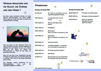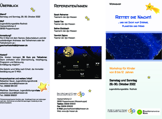Alle lieben einen funkelnden Himmel mit vielen Sternen, Sternschnuppen und einem großen Mond. Dabei ist es gar nicht mehr so leicht, eine natürliche Nacht zu erleben. Aber was genau ist eine natürliche Nacht? Und was können wir tun, um die Sicht auch in der Stadt auf Sterne, die Milchstraße und die Planeten zu retten? Und was hat das Insektensterben mit Licht zu tun? All das erfahren Kinder im Alter von acht bis 12 Jahren beim Workshop „Rettet die Nacht“, der am Samstag und Sonntag, 29. und 30. Oktober 2022 in der Jugendbildungsstätte in Rodholz stattfindet.