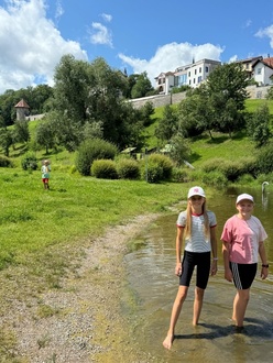 Heute Morgen machten wir Frühsport. Dann frühstückten wir und dann haben wir uns umgezogen für die Wanderung. Wir wanderten zu einem Wasserspielplatz und aßen dort Bratwürstchen. Wir wanderten auch noch zum Mikado-Spielplatz und aßen auch noch leckeren Kuchen. Dann wanderten wir zum Zeltplatz zurück. Wir durften dann noch ein bisschen ausruhen. Dann aßen wir noch zu Abend und wir durften nach dem Abendessen noch ein bisschen spielen.