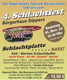 Der 1. Fegerländer Fanclub Deutschland 2013 e.V. veranstaltet am Samstag, 01.11.2025 um 18.30 Uhr das traditionelle 3. Dipperzer Schlachtfest im Bürgerhaus Dipperz.