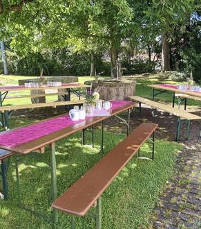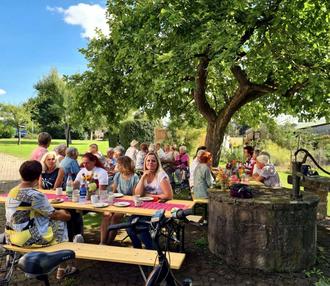Liebevoll hatte das Vorbereitungsteam Petra Link, Christine Müller, Anke Müller, Gaby Bethmann und Andrea Goldbach ein schattiges Plätzchen unter den Bäumen am Brunnen hergerichtet.