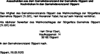 Das Mitglied des Gemeindevorstands Dipperz des Wahlvorschlags der Bürgerliste Gemeinde Dipperz (BLGD), Herr Alexander Fabel, hat auf sein Mandat verzichtet.