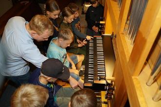 Aus welchen Bauteilen besteht eine Orgel? Wie viele Pfeifen hat eine Orgel? Wie kommt Luft in die Pfeifen und wieder heraus? Warum zieht man Registerzüge? Zu diesen und vielen weiteren Fragen gab es spannende und interessante Antworten. Eigenständiges Experimentieren war ebenfalls möglich, den einzelnen Orgelpfeifen konnte man durch Hineinpusten hohe und tiefe Töne entlocken. Um die Orgelpfeifen aus der Nähe zu betrachten, kletterten die Schülerinnen und Schüler in das Innere der Orgel. Selbst in die Tasten greifen, Register ziehen und mit den Füßen das Pedal bedienen – der Spaß am Ausprobieren stand im Vordergrund der Veranstaltung.