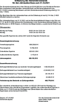 Der Jahresabschluss zum 31.12.2021 und der Rechenschaftsbericht liegen in der Zeit vom 17.10. bis 26.10.2022 während der Dienststunden in der Gemeindeverwaltung Dipperz, Am Dorfbrunnen 2, 36160 Dipperz, im Zimmer des Bürgermeisters, zu jedermanns Einsicht aus.