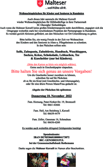 Auch dieses Jahr sammeln die Malteser Kerzell wieder Weihnachtspäckchen für Hilfsbedürftige in ihrer Partnerstadt Sf. Gheorghe/ Siebenbürgen.