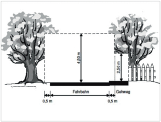 Dagegen muss die Fahrbahn bis zu einer lichten Höhe von 4,5 Metern von jeglichem Überhang frei sein (siehe Grafik).