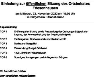 | TOP 1 | Eröffnung der Sitzung sowie Feststellung der Ordnungsmäßigkeit der Ladung, der Anwesenheit und der Beschlussfähigkeit |