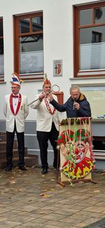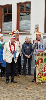 Bei einem sehr gut besuchten närrischen Bürgerhaus Vorplatz und einer kurzen Ansprache übergab Bürgermeister Klaus Dieter Vogler (parteilos) den Rathausschlüssel in die Hände der Karnevalisten, angeführt durch den Präsidenten Dr. Carsten Schütz.