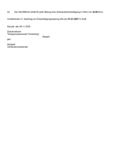 | (3) | Der Schriftführer erhält für jede Sitzung eine Aufwandsentschädigung in Höhe von 32,00 Euro. | ||