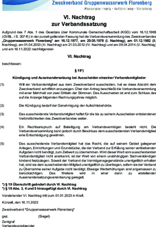 Aufgrund des 7 Abs. 1 des Gesetzes über Kommunale Gemeinschaftsarbeit (KGG) vom 16.12.1969 (GVBL. I S. 307 ff.) in der zurzeit geltenden Fassung hat die Verbandsversammlung des Zweckverbandes „Gruppenwasserwerk Florenberg“ am 16.12.1977, am 29.05.1978 (I. Nachtrag), am 01.12.1982 (II. Nachtrag), am 01.04.2003 (III. Nachtrag) am 21.03.2012 (IV. Nachtrag) und am 09.04.2014 (V. Nachtrag) und am 16.11.2022 nachfolgenden