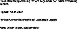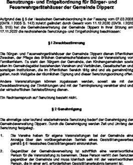 Aufgrund des § 5 der Hessischen Gemeindeordnung in der Fassung vom 07.03.2005 (GVBl. I 2005 S. 142) zuletzt geändert durch Gesetz vom 11.12.2020 (GVBl. I 2020 S. 915) hat die Gemeindevertretung der Gemeinde Dipperz in ihrer Sitzung am 17.11.2022 die nachstehende Benutzungs- und Entgeltordnung beschlossen: