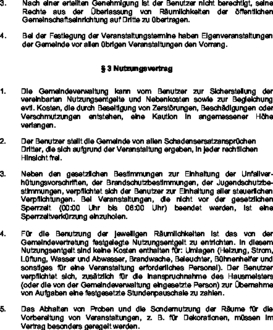 | 2. | Gegenüber der Gemeindeverwaltung ist schriftlich eine verantwortliche Person für die Veranstaltung zu benennen. Diese Person vertritt den Benutzer gegenüber der Gemeinde und muss identisch sein mit der verantwortlichen Person, die in einer evtl. erforderlichen Gaststättenerlaubnis benannt ist. |