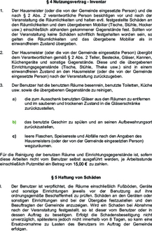 | 3. | Der Benutzer hat die benutzten Räume besenrein, benutzte Toiletten, Küche usw. sowie die übergebenen Gegenstände zu reinigen, | |