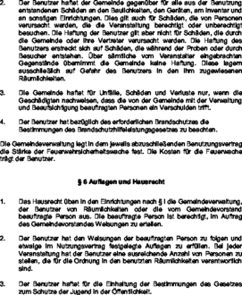 | 2. | Der Benutzer haftet der Gemeinde gegenüber für alle aus der Benutzung entstandenen Schäden an den Baulichkeiten, den Geräten, am Inventar und an sonstigen Einrichtungen. Dies gilt auch für Schäden, die von Personen verursacht werden, die die Veranstaltung berechtigt oder unberechtigt besuchen. Die Haftung der Benutzer gilt aber nicht für Schäden, die durch die Gemeinde oder ihre Vertreter verursacht werden. |