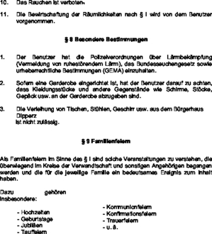 | 3. | Neben den gesetzlichen Bestimmungen zur Einhaltung der Unfallverhütungsvorschriften, der Brandschutzbestimmungen, der Jugendschutzbestimmungen, verpflichtet sich der Benutzer zur Einhaltung aller steuerlichen Verpflichtungen. Bei Veranstaltungen, die nicht vor der gesetzlichen Sperrzeit (00:00 Uhr bis 06:00 Uhr) beendet werden, ist eine Sperrzeitverkürzung einzuholen. |