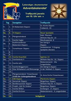 Endlich geht es wieder los. Unser Ökumenischer Lebendiger Adventskalender startet wieder. Kommen Sie an den angegeben Tagen zu dem jeweiligen Türchen immer um 18 Uhr. Wir freuen uns sehr.