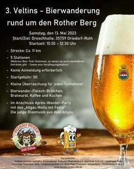 Am 13. Mai 2023 findet zum dritten mal die Veltins-Bierwanderung "Rund um den Rother Berg" statt. Gestartet werden kann von 10:30 Uhr bis 12:30 Uhr an der Dreschhalle Driedorf-Roth. Die Startgebühr beträgt 5€ pro Person. Auf der ca. 11 km langen Stecke gibt es 5 Stationen, an denen die Vielfalt der Biere der Veltins-Brauerei und alkoholfreie Getränke angeboten werden. An der dritten Station werden außerdem Hausmacher Wurstbrote, Schmalzbrote und Laugenbrezeln zur Stärkung gereicht. In der Dreschhalle spielt anschließend die jungen Blasmusik-Kapelle „Allgäu Molla mit Fehla“ aus Kimratshofen auf.