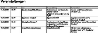 | Datum | Uhrzeit | Ort | Veranstaltung | Veranstalter |