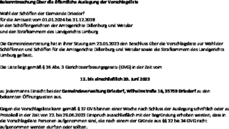 Die Gemeindevertretung hat in ihrer Sitzung am 23.05.2023 den Beschluss über die Vorschlagsliste zur Wahl der Schöffinnen und Schöffen für die Amtsgerichte Dillenburg und Wetzlar sowie die Strafkammern des Landgerichts Limburg gefasst.